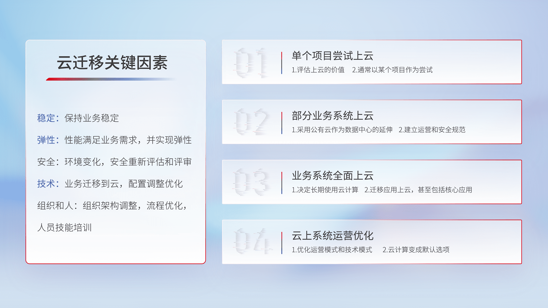 结合实际业务,,,,从规划设计、、、、云平台选型、、云原生改造、、、、数据迁移、、、集成交付,,,,迁移全过程为客户识别最佳上云路径,,,做好风险识别管理,,设计网络架构、、、身份权限、、安全审计合规、、、操作审计、、、日志审计、、、、监控告警策略、、多站点容灾设计等,,对云上基础设施进行整体规划,,,,提升IT治理水平,,,以满足弹性、、高可用、、、高性能的需求。。。