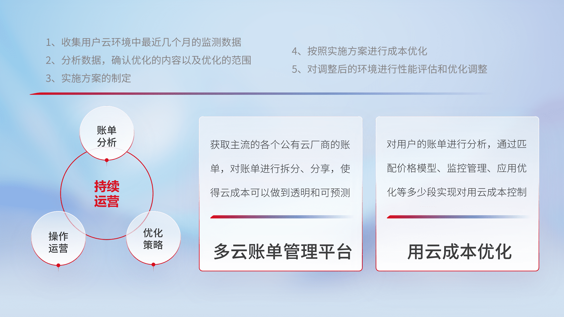 监控业务系统资源开销,,,,对资源的消耗精确计量,,,,实现费用的透明化管理,,不断提升资源使用率,,,,调整资源购买方式,,,降低资源费用成本,,用云成本可预测、、、用云费用可优化,,云资源配额有据可依。。