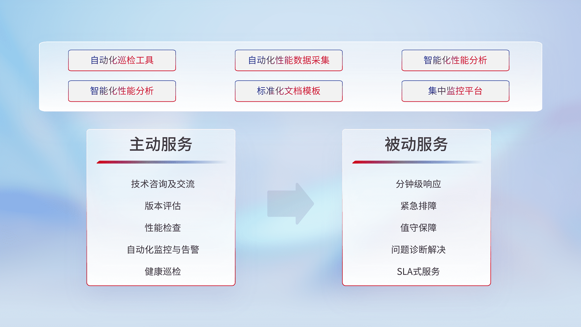 智能化工具和标准化文档,,保障服务质量,,,,提供主动服务(包含技术咨询、、、版本评估、、、性能检查、、、、自动化监控与告警、、、、健康巡检)和被动服务包含(分钟级响应、、、紧急排障、、、、值守保障、、、问题诊断解决、、、、SLA服务)。。。。
